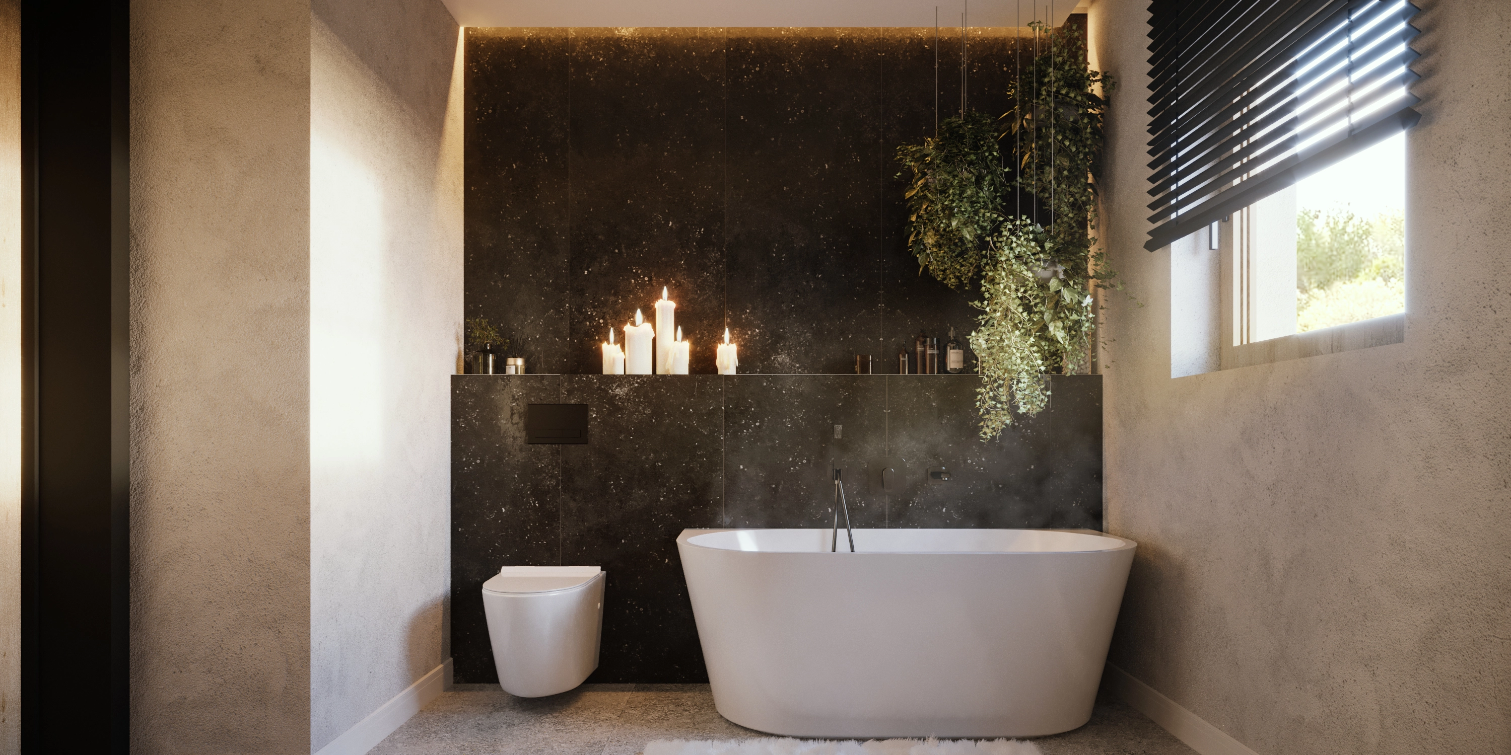 - Łazienka została zaprojektowana z myślą o maksymalnym komforcie - z funkcjonalnymi meblami i industrialnym oświetleniem.