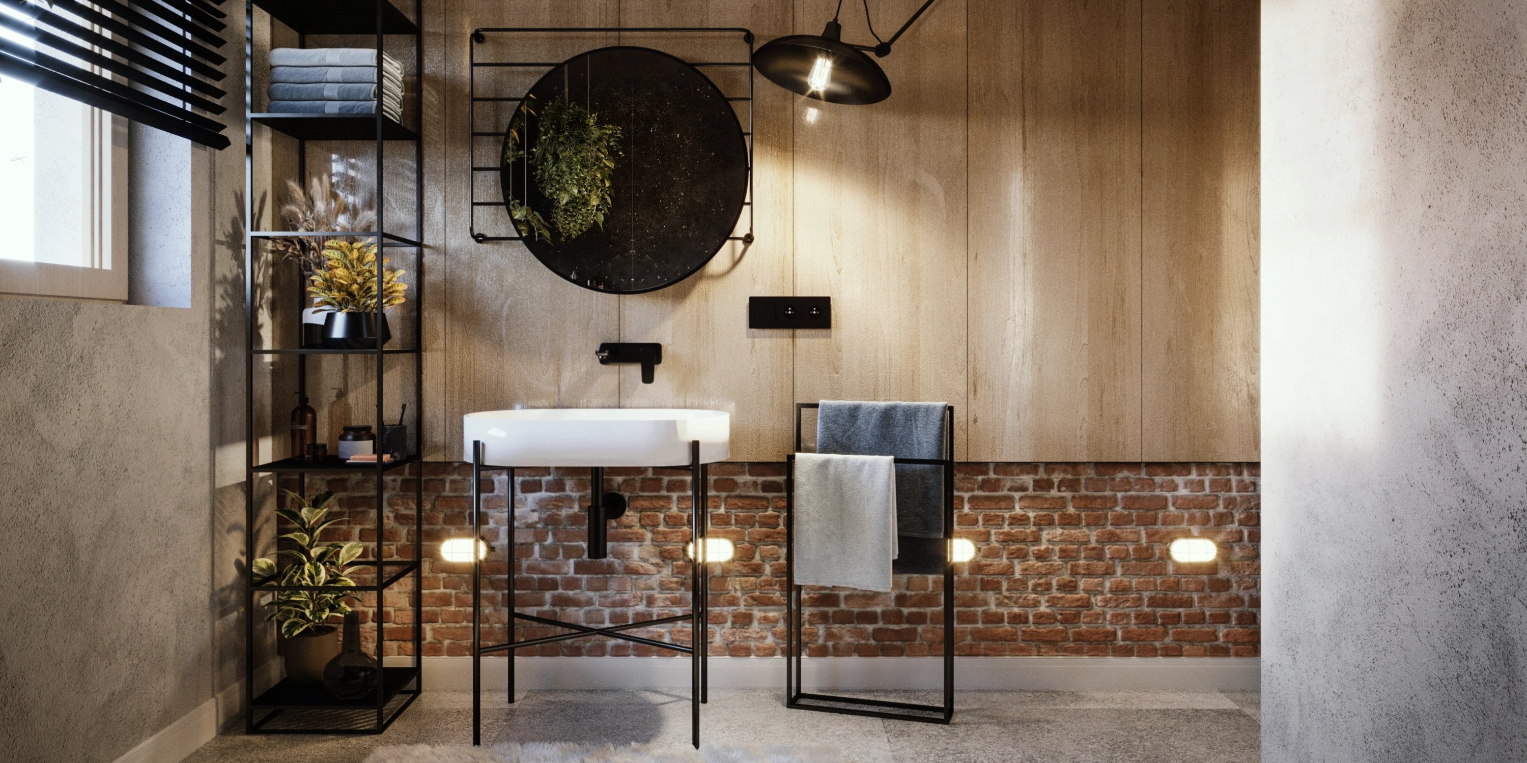 - Łazienka została zaprojektowana z myślą o maksymalnym komforcie - z funkcjonalnymi meblami i industrialnym oświetleniem.