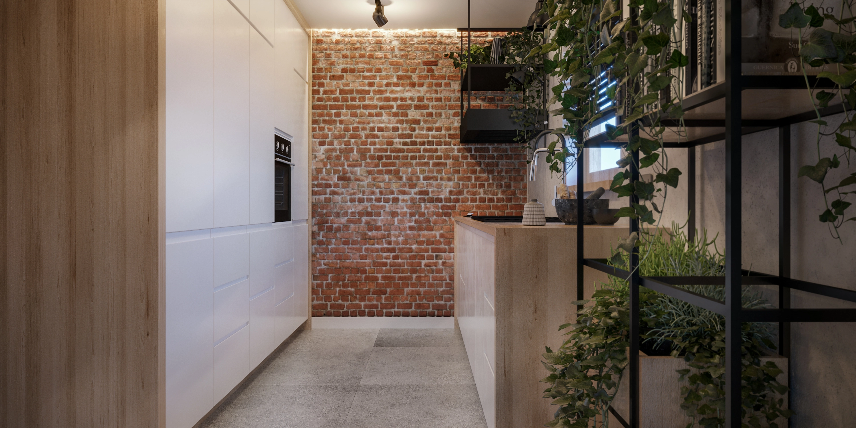 Aranżacja utrzymana jest w charakterystycznym stylu loftowym, opartym na surowych, ale szlachetnych materiałach. Betonowe tynki zostały przełamane cegłą i ocieplone drewnem, które równoważy chłód metalu i nadaje wnętrzu bardziej przyjaznego charakteru.