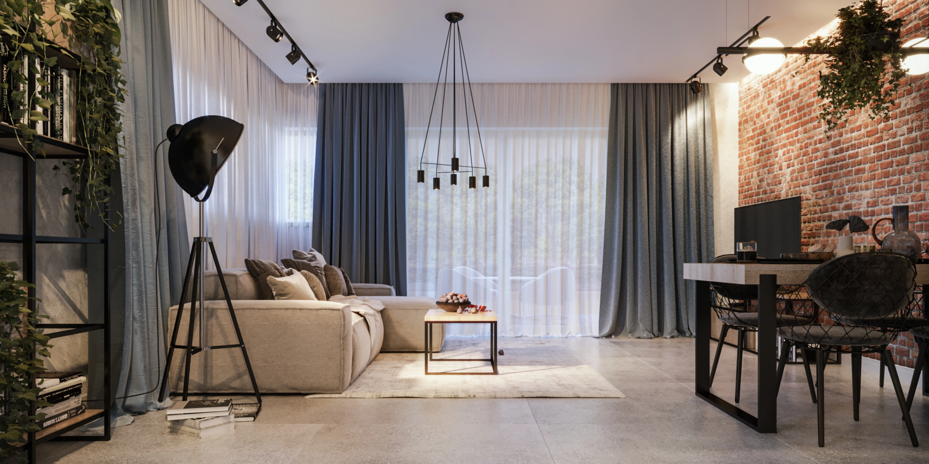 Mieszkanie nie jest jednak typowo industrialne - dzięki miękkiej kanapie, zasłonom w oknach i dodatkom w postaci roślinności udało się uzyskać efekt przytulności, który sprawia, że przestrzeń jest idealna do codziennego życia.